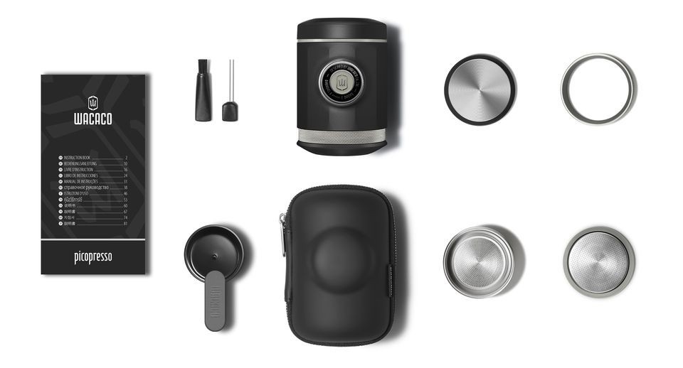 Встроенный ручной насос создает давление 18 бар. Вес 350 грамм, объем для приготовления кофе 80 мл.