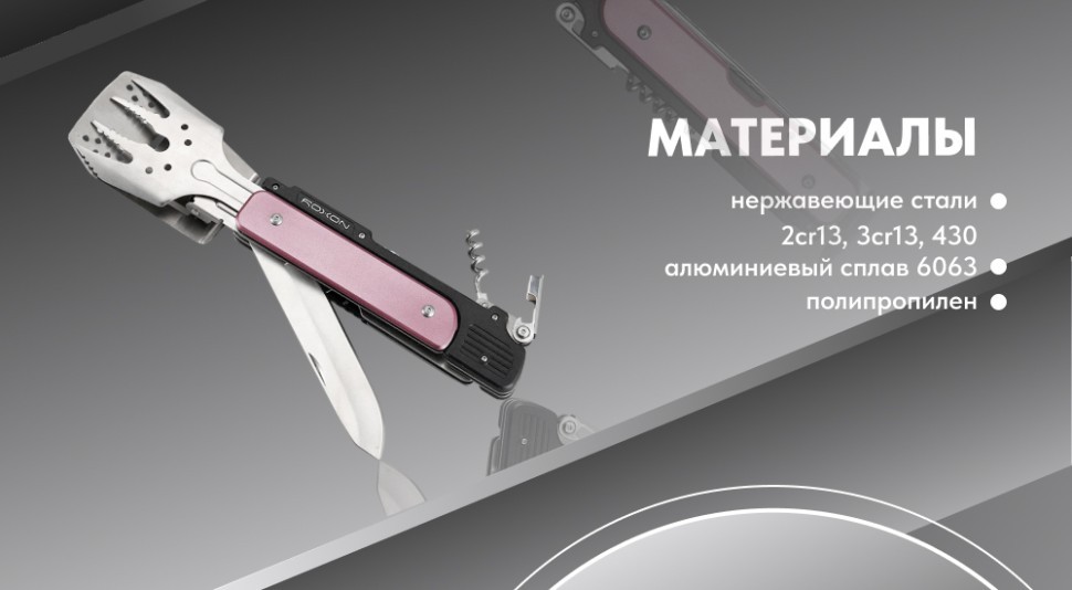 - мультиинструмент сделан из сталей 430,3Cr13, 2Cr13, алюминия 6063