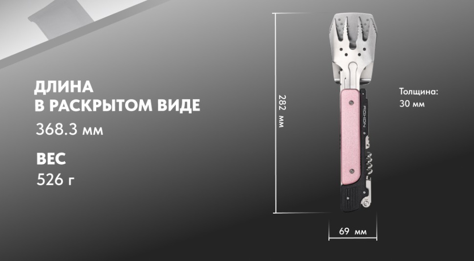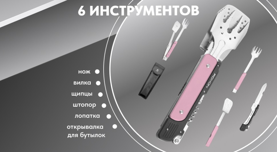 Roxon Multi BBQ Tool — полезный и компактный инструмент для приготовления мяса или других продуктов на гриле. Он представляет собою несколько отдельных инструментов, соединенных между собою. Таким образом, весь набор будет под рукою и не придется, собираясь на природу, искать все нужные инструменты по отдельности.
