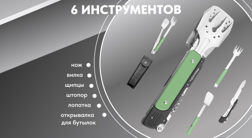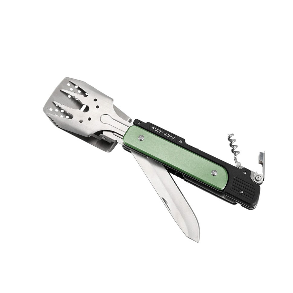 Roxon Multi BBQ Tool — полезный и компактный инструмент для приготовления мяса или других продуктов на гриле. Он представляет собою несколько отдельных инструментов, соединенных между собою. Таким образом, весь набор будет под рукою и не придется, собираясь на природу, искать все нужные инструменты по отдельности.
