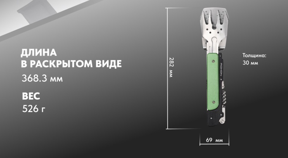 В сложенном положении размеры мультитула составляют 282 x 69 x 30 мм. Он достаточно компактный для удобного хранения и комфортной транспортировки. Набор легко помещается в рюкзак или сумку. В раскрытом виде длина инструментов составляет 368.3 мм.