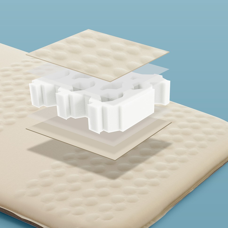 Конструкция коврика продумана до мелочей. Он состоит из пяти слоев: приятная для кожи эластичная ткань 30D, два воздухонепроницаемых слоя ТПУ, слой высокоэластичной пены с открытыми порами и износостойкий нижний слой из эпонжа. Такое сочетание материалов обеспечивает отличную теплоизоляцию, мягкость, устойчивость к повреждениям и долговечность. Зонированная структура коврика — с чередующимися полыми участками и зонами из высокоэластичной пены — позволяет сохранять тепло и поддерживать тело во время отдыха, обеспечивая максимальный комфорт.