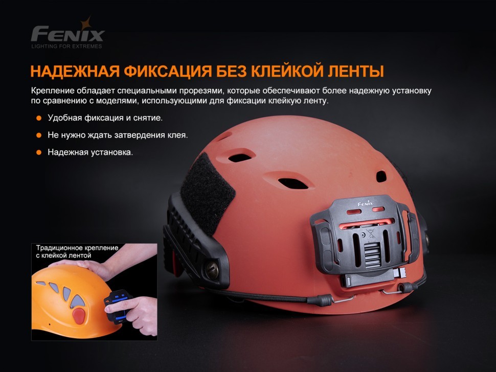 Монтажный набор Fenix ALG-04 обладает стандартным слотом для установки различных моделей налобных фонарей Fenix. Его размеры — 85 х 55 мм, что обеспечивает надежную фиксацию и предотвращает падение прибора во время работы.