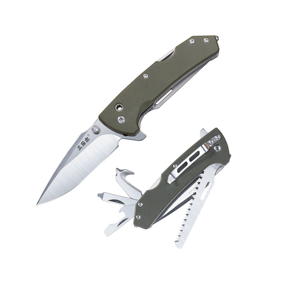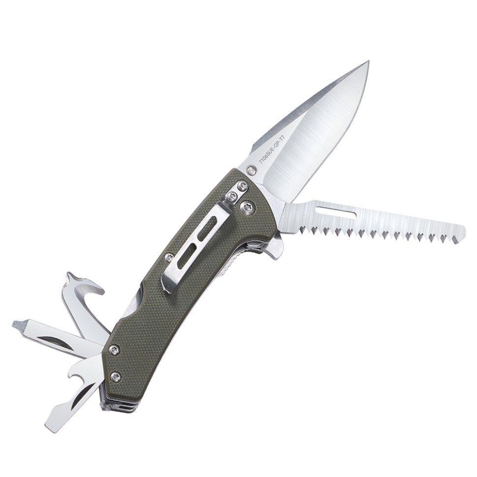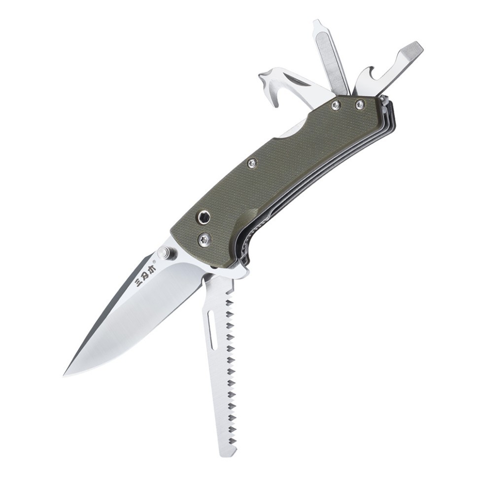 Sanrenmu 7106SUE-GP-T7 оборудован набором полезных инструментов, делающих его полноценным мультитулом: крестовая и две плоские отвертки (широкая и узкая), пила, напильник, стропорез, стеклобой и открывалка. Для удобства ношения предусмотрена клипса, позволяющая закрепить нож на кармане, поясе или снаряжении.