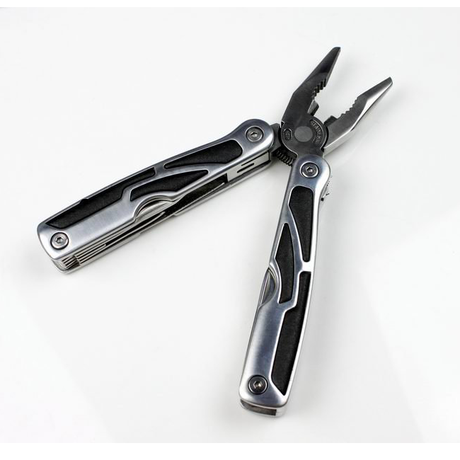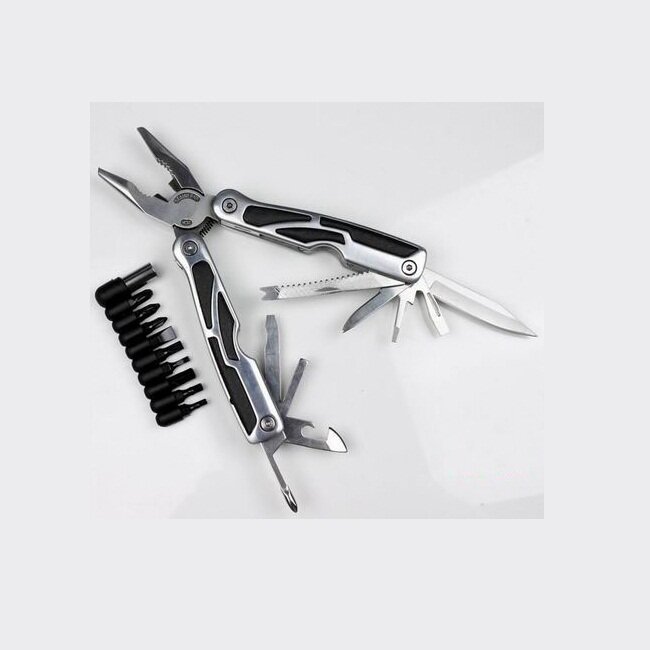 кусачки,плоскогубцы,средняя отвертка плоская,маленькая отвертка плоская,крестообразная отвертка,нож,рыбочистка,открывалка для бутылок,линейка, напильник,извлекатель крючков,захват для гаек и цилиндров,шило,держитель бит,10 сменных насадок в комплекте