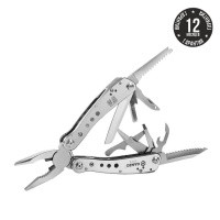 плоскогубцы,кусачки,маленькая отвертка плоская,нож,серрейтор,консервный нож,открывалка для бутылок,для снятии изоляции,пила,захват для гаек и цилиндров,ножницы,шило,держатель бит,11 сменных насадок в комплекте