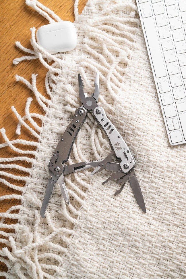 Модель выполнена в серебристом цвете. Фигурные вырезы на рукоятках снижают вес мультитула, что делает его удобнее для длительного использования. Насечки на торцах рукояток обеспечивают надежный хват, что особенно важно при работе мокрыми руками.