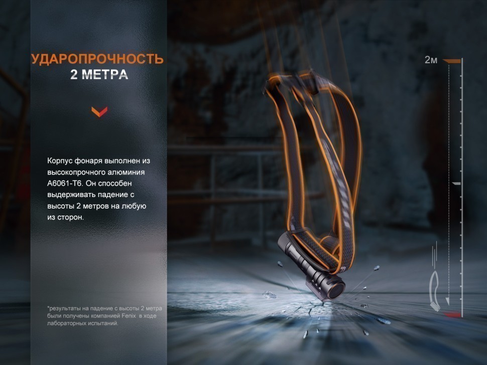 Благодаря использованию алюминия в качестве основного материала для корпуса, фонарь выдерживает падения с двухметровой высоты без негативных последствий для электроники. Металл дополнительно обработан методом жесткого анодирования, поэтому невосприимчив к окислению и ржавлению.