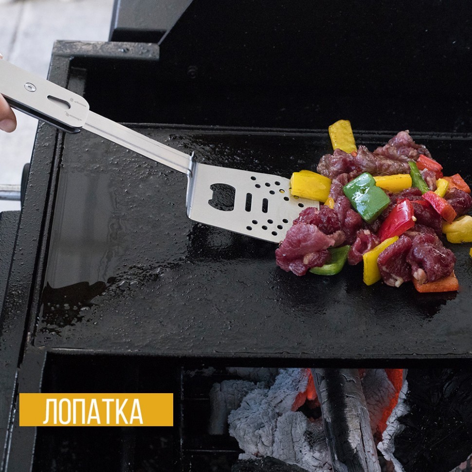 Вилка имеет 4 зубчика с небольшими зазубринами для большей надежности. Лопатка немного изогнута, чтобы работать ней было удобнее. Кроме того, на ее поверхности сделан целый ряд отверстий, чтобы сквозь них мог стекать лишний жир. Самое большое отверстие – это встроенная открывалка для бутылок.