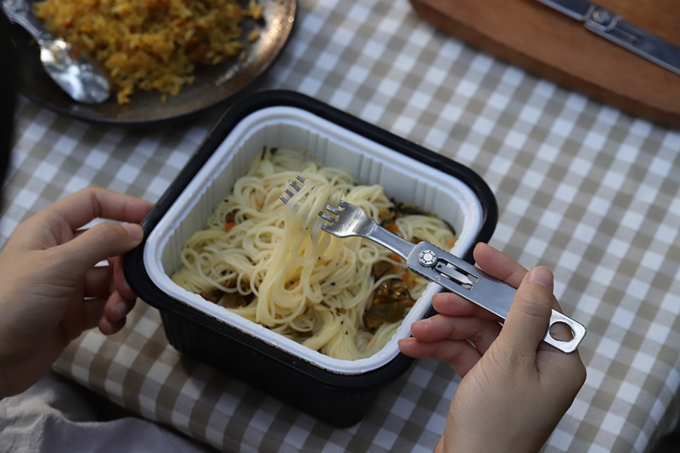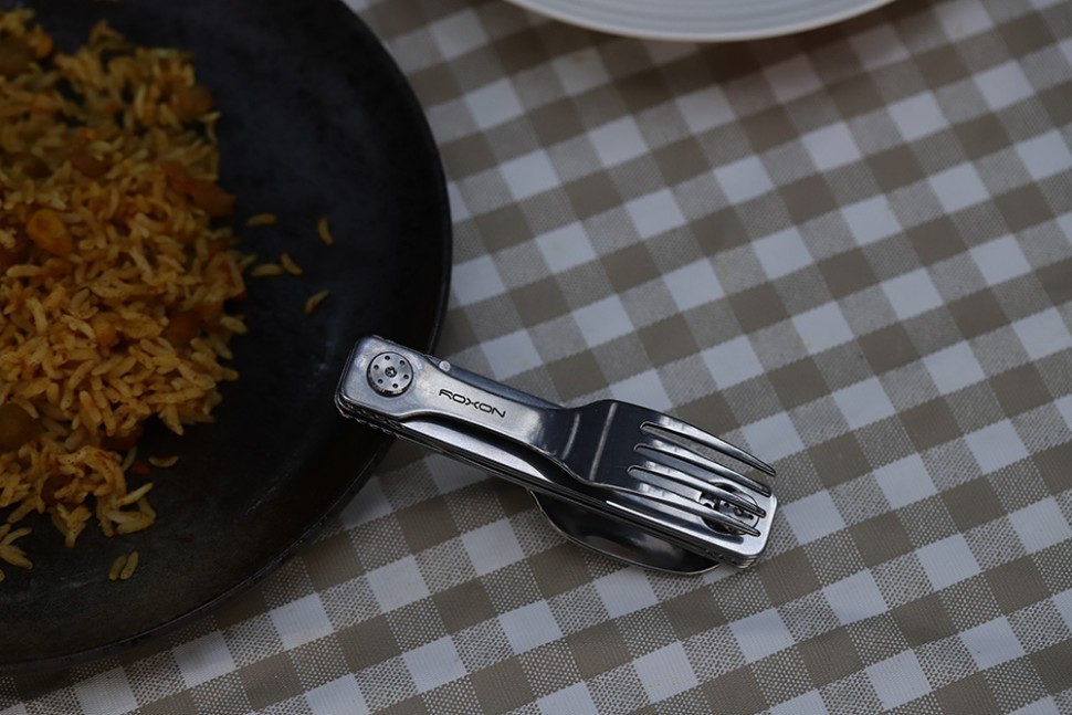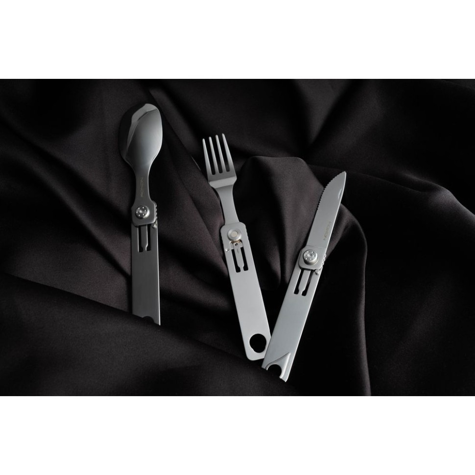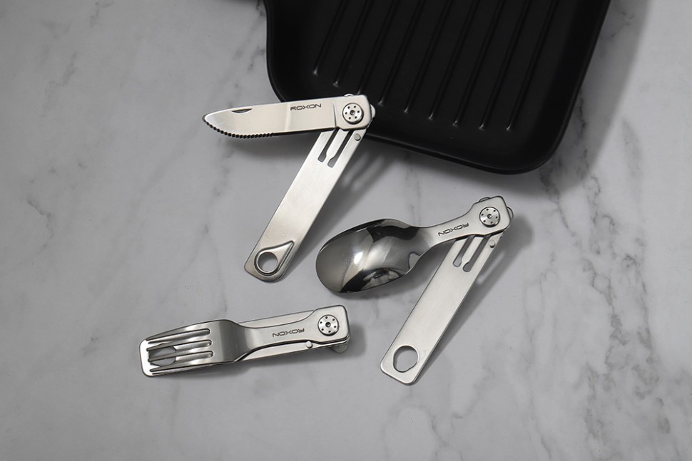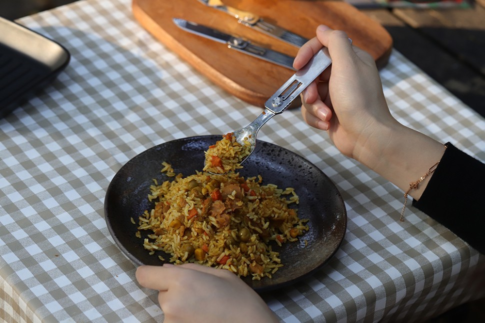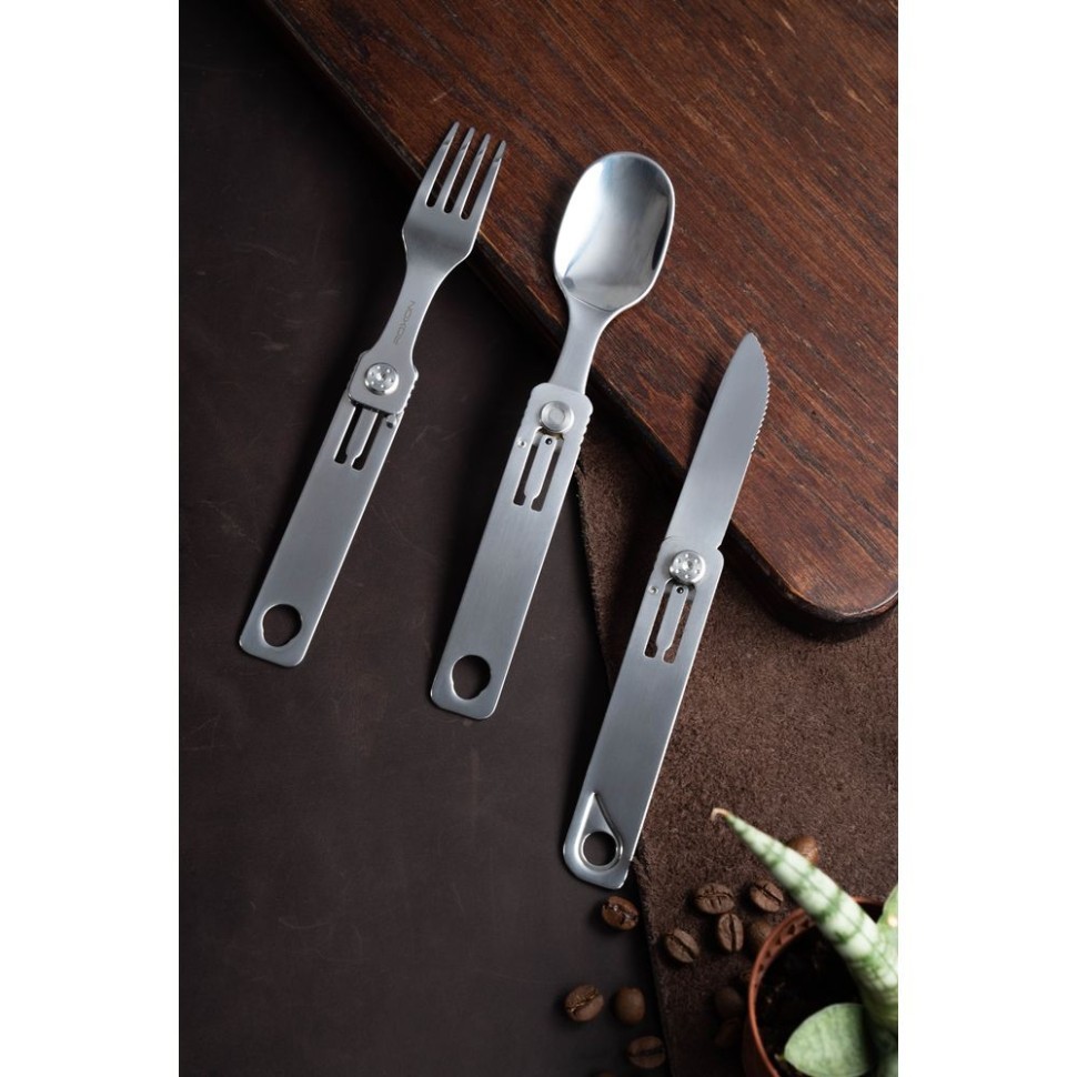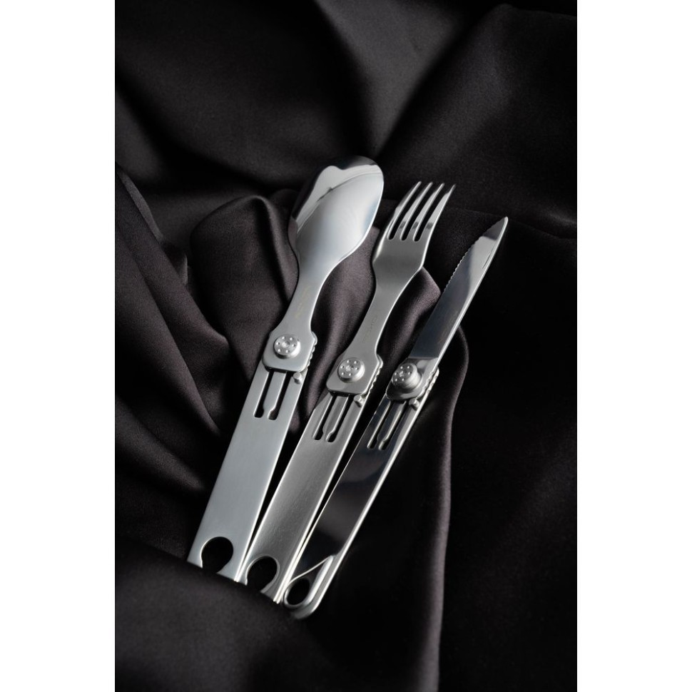 Компактные столовые приборы рассчитаны на использование в условиях туристических походов и иных занятий на свежем воздухе. Складные кухонные приборы имеют удобную конструкцию, которая совмещает в себе сразу три приспособления: нож с серрейторной заточкой, вилку и ложку. Этого набора хватит, чтобы трапезничать на природе. Ложка, вилка и нож легко складываются и раскладываются. Компактный дизайн позволяет сэкономить 50% места для хранения. Комфортные столовые приборы позволят вам наслаждаться процессом употребления пищи в любых условиях. Даже если это происходит далеко от дома.
