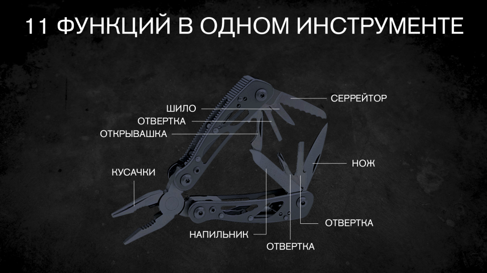 Все компоненты мультитула изготовлены из качественных материалов, а сам инструмент аккуратно собран. Металл покрыт стойкой порошковой краской черного цвета, что делает дизайн инструмента более оригинальным и дополнительно защищает его от ржавления.