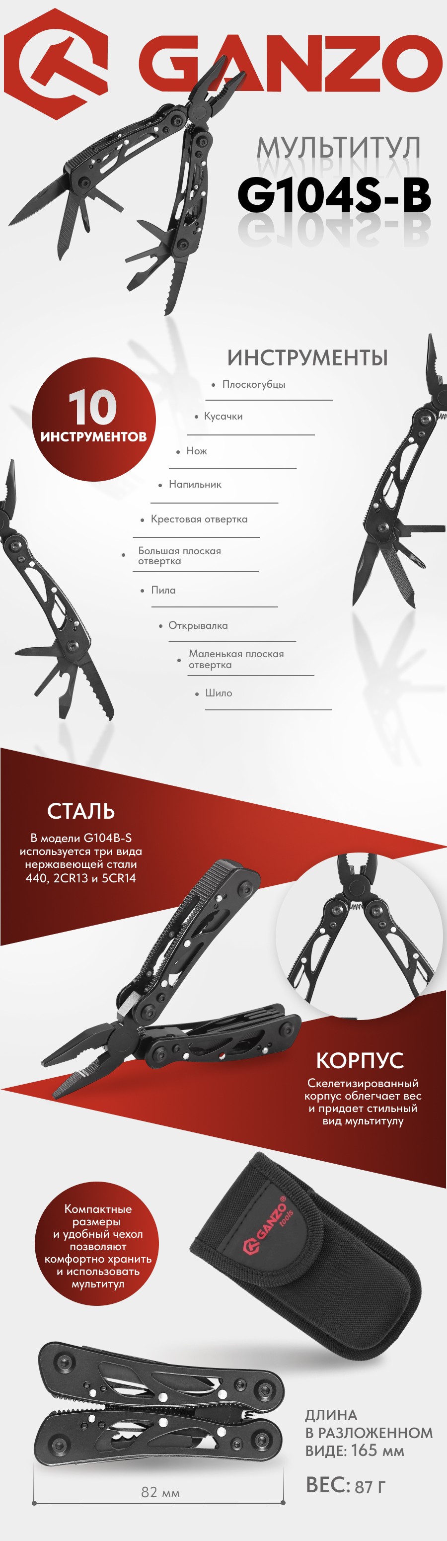 Скелетонизированная рукоять складного мультитула облегчает его вес, а в сочетании с черным покрытием придает инструменту современный и стильный внешний вид. Несмотря на мини-формат, Ganzo G104S-B демонстрирует отличную прочность и функциональность, сравнимую с крупными мультитулами. Длина мультитула в разложенном виде составляет 16,5 см, а в сложенном — 8,2 см. Весит инструмент всего 87 грамм. Компактный и легкий инструмент не утяжелит ваш багаж. Для удобства и безопасного хранения в комплекте предусмотрен нейлоновый чехол.