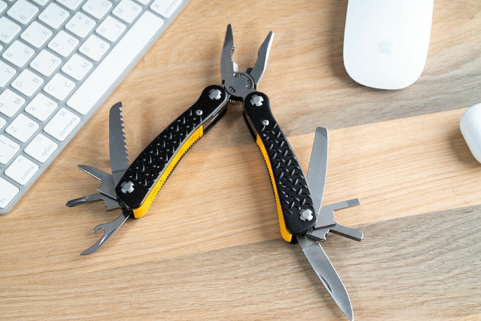 Рукоятки выполнены в черном цвете. Рельефное покрытие улучшает сцепление с рукой — мультитул не выскользнет при использовании, даже если руки мокрые или грязные. Изогнутая форма рукояток и желтые пластиковые вставки для упора большого пальца делают работу с инструментом комфортной и точной.