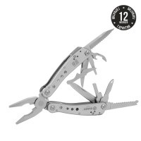 Мультитул Ganzo G201 представляет из себя практичный инструмент для ремонта любого снаряжения или даже техники в походных условиях. Он довольно компактный и легкий (265 грамм), чтобы его было удобно брать с собою в поездки. В то же время, Ganzo G201 успешно справляется с 25 различными функциями. Главный инструмент в данной модели — плоскогубцы с кусачками и держателем круглых предметов. Остальные элементы представляют собою компактные инструменты, размещенные внутри рукояток, наподобие швейцарского ножа. Это ножи с гладкой и серрейторной заточкой, пила, открывалка для консервов, ножницы, шило, две небольшие плоские отвертки. Помимо того, большой набор сменных наконечников для отвертки вынесен в отдельный органайзер. Они закрепляются на держателе мультитула при помощи магнитного переходника.