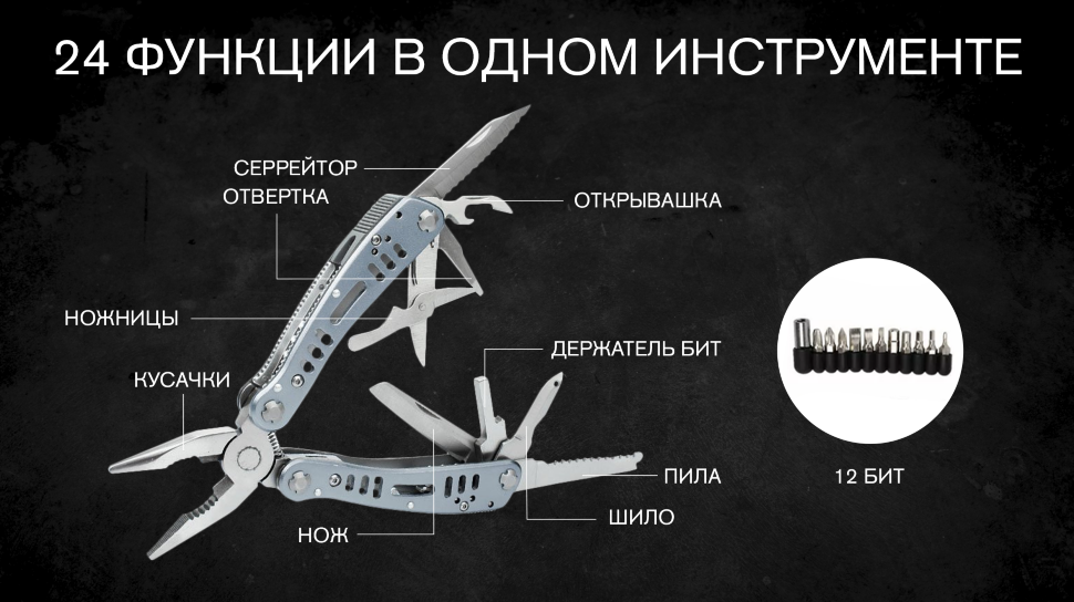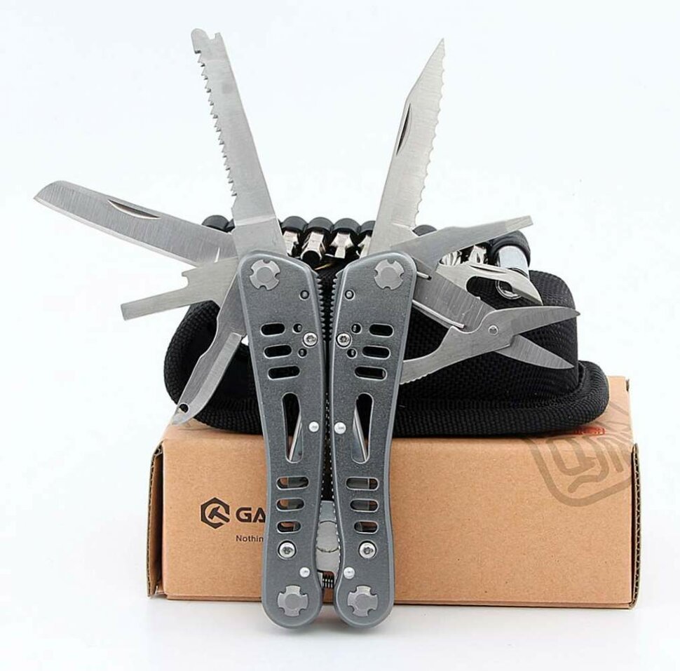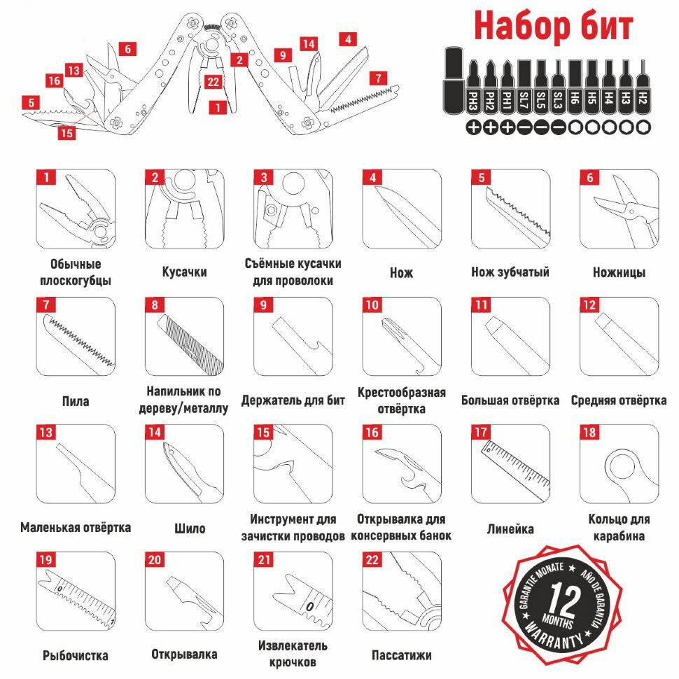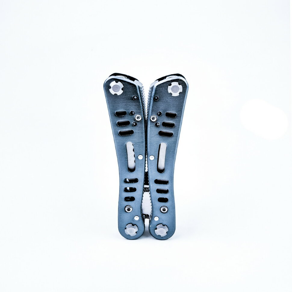 Модель Ganzo G203 представляет из себя полноценные плоскогубцы с мощными кусачками и возможностью плотного захвата круглых предметов, а также целым комплектом дополнительных инструментов внутри рукояток. В качестве материала для мультитула этой модели используется сталь 440С. Она относится к разряду нержавеющих сплавов с хорошими показателями твердости. Все элементы мультитула покрыты дополнительным слоем черной порошковой краски, которая также оберегает металл от коррозии. Это современное и очень стойкое покрытие, которое не стирается в процессе использования инструментов. А матовый черный мультитул выглядит действительно стильно и очень презентабельно. Из дополнительных инструментов, в модели Ganzo G203 присутствуют пила, серрейторный и обыкновенный нож, миниатюрные ножницы, открывалка, шило, маленькие ножнички, держатель для сменных бит. Все сменные насадки для отвертки хранятся в одном общем органайзере и закрепляются на держателе при помощи магнитного переходника. Мультитул вместе с битами хранится в плотном чехле из нейлона, который закрывается на кнопку, легко стирается в случае необходимости и быстро высыхает, если намокнет.