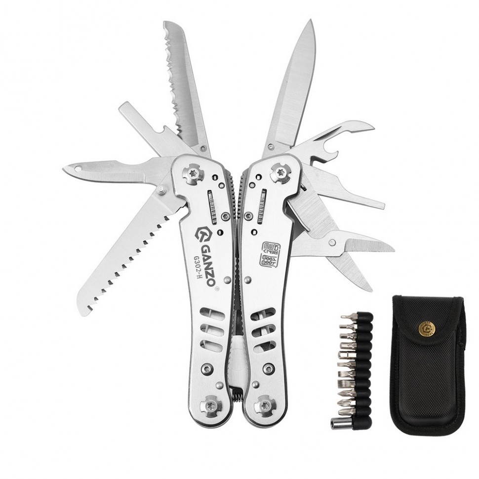 Основной инструмент в мультитуле Ganzo G302-Н — это плоскогубцы. Они наделены функцией кусачек и возможностью крепкого захвата гаек, втулок и других круглых в сечении предметов. Остальные инструменты распределены между двумя рукоятками мультитула и размещены внутри них. Сменные биты размещены в одном общем органайзере, который храниться в нейлоновом чехле.