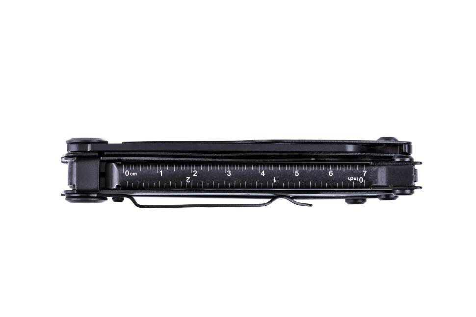 - 16 инструментов (острогубцы, плоскогубцы, обычные кусачки, кусачки для жесткой проволоки, кусачки для толстой проволоки, серрейторная пила, нож с прямой заточкой, отвертка Phillips, плоская отвертка, инструмент для зачистки проводов, инструмент для обрезки лески, ножницы, консервный нож, открывалка для бутылок, стеклобой, линейка);