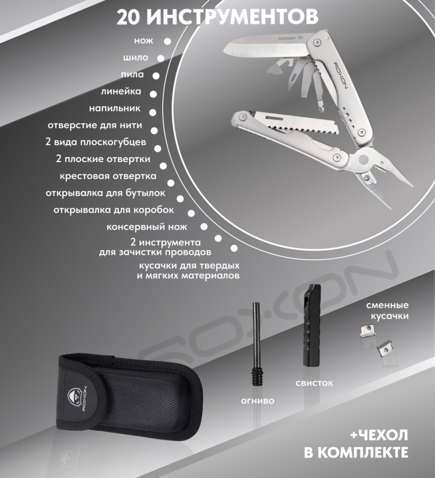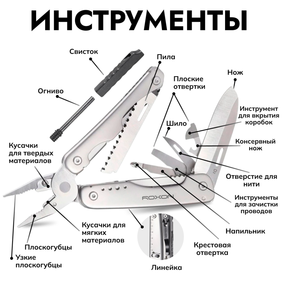 В Roxon Flash Elite S803E количество инструментов увеличено до 20. В мультитуле представлены: