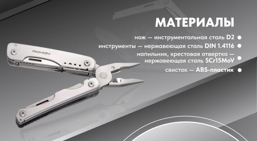 - материалы — инструментальная сталь D2 (нож), нержавеющая сталь 5Cr15MoV (крестовая отвертка и напильник), нержавеющая сталь DIN 1.4116 (остальные инструменты), ABS-пластик (свисток)