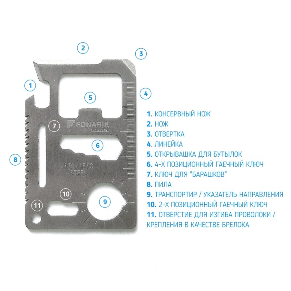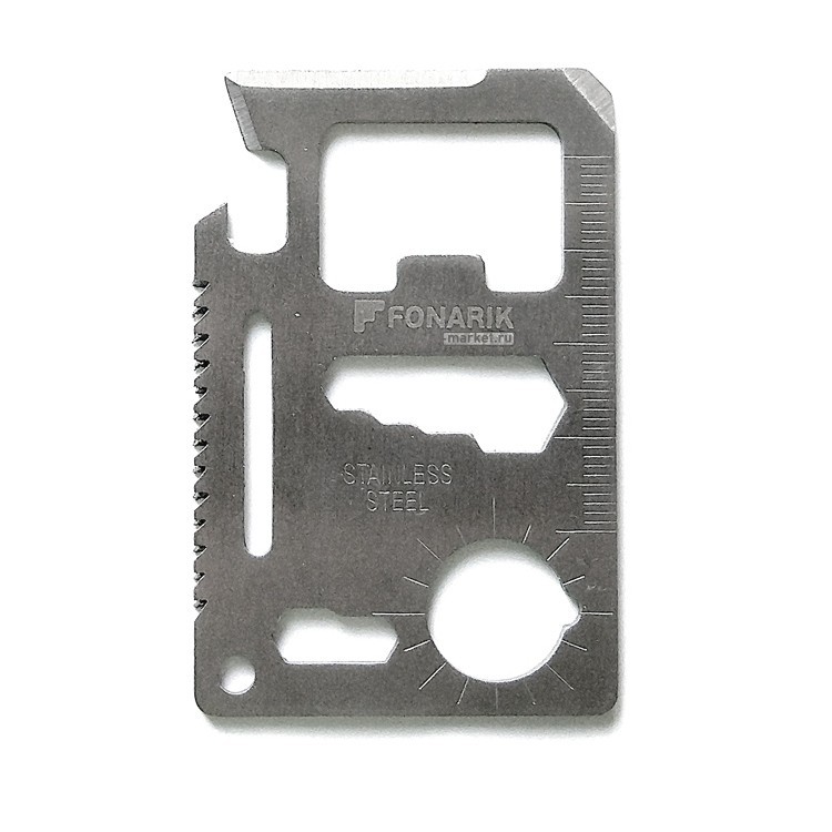 Мультитул Fonarik-market — это оригинальный и практичный инструмент, который придет на помощь в любой ситуации. Он выполнен в формате визитки, хотя даже меньше нее по размерам. Общие габариты мультитула составляют 6,9х4,5х0,2 см. Весит он около 30 грамм. Чтобы инструмент было удобно носить с собою в постоянной доступности для использования, его можно прикрепить как брелок, например, на ключи.