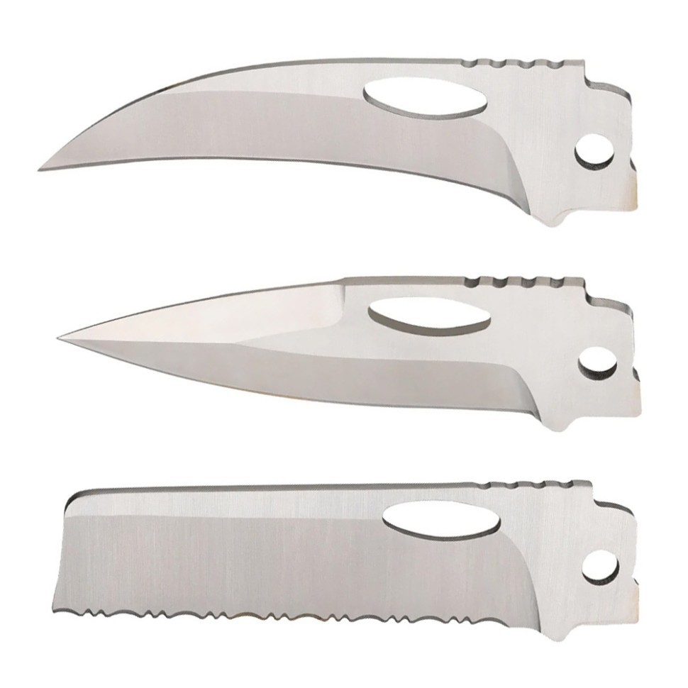 Комплект состоит из трех лезвий — Serrated Blade, Spear Point Blade, Talon Blade. Лезвия изготовлены из высококачественной нержавеющей стали марки 8Cr13MoV. Она обладает высокой твердостью, износостойкостью и хорошей коррозионной стойкостью. На всех лезвиях со стороны обуха расположено подпальцевое отверстие для удобного раскрытия ножа.