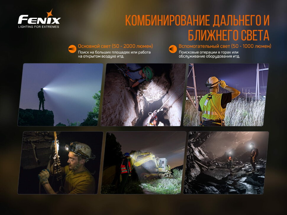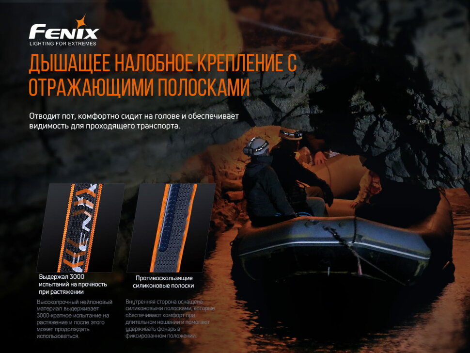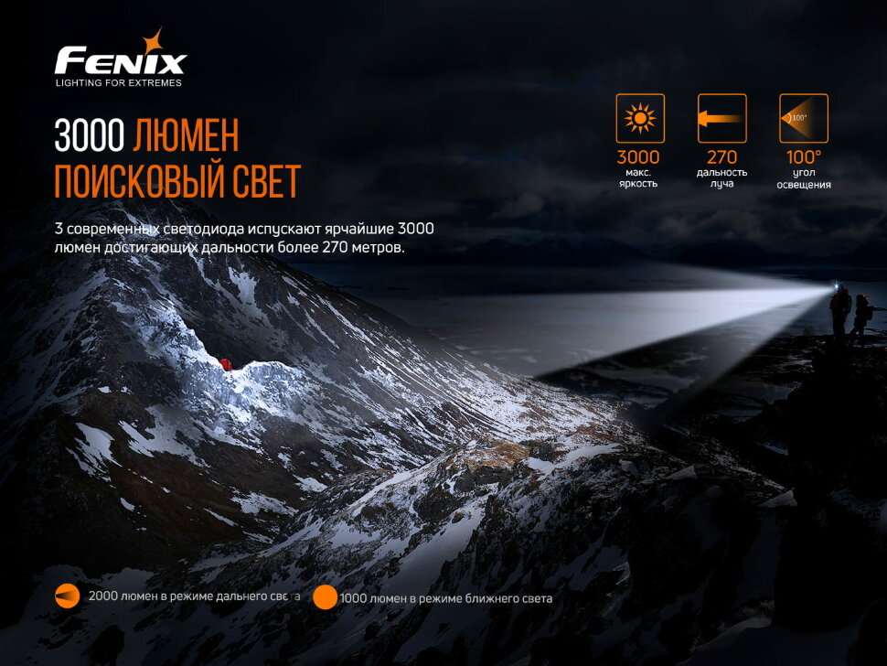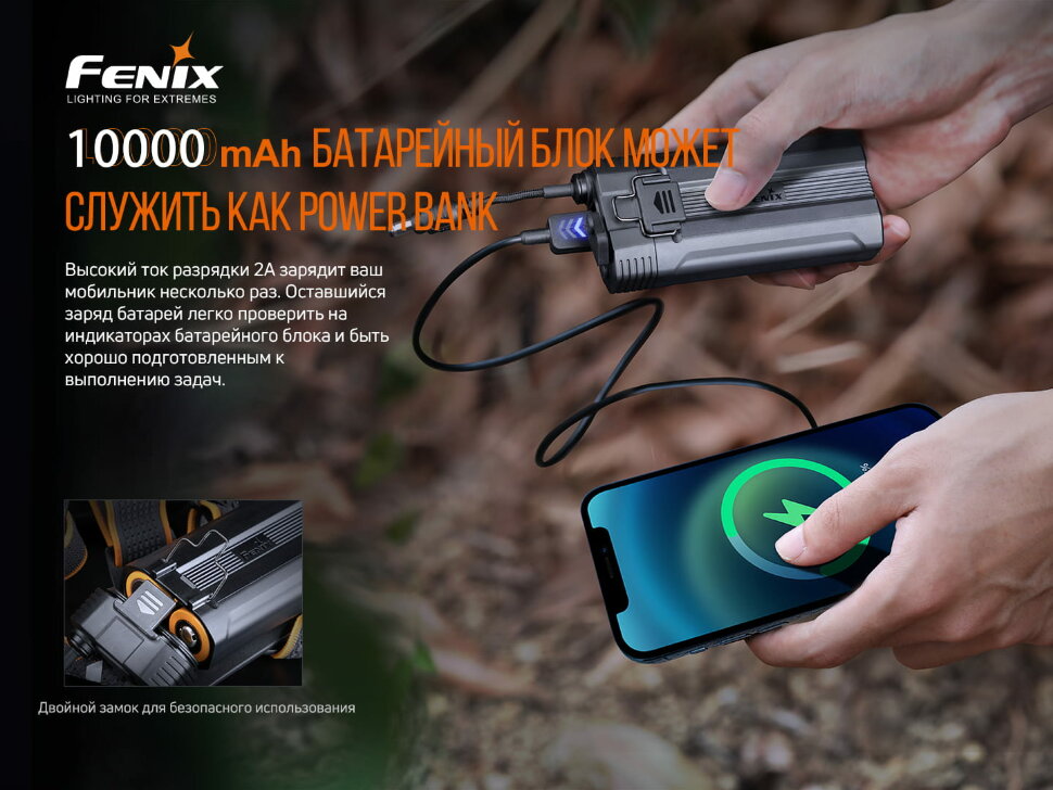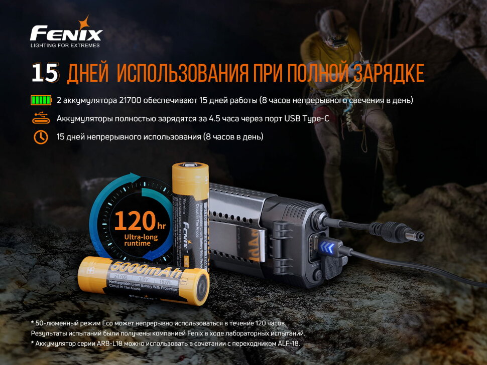 | Комплектация | Фонарь, 2 аккумулятора Fenix ARB-L21-5000 Li-ion, USB Type-C кабель для зарядки, 4 крючка для крепления на шлем, 3 клипсы для кабеля, крепление для ремня из нержавеющей стали, удлинительный кабель, запасное уплотнительное кольцо, инструкция, гарантийный талон. | ||||||||||