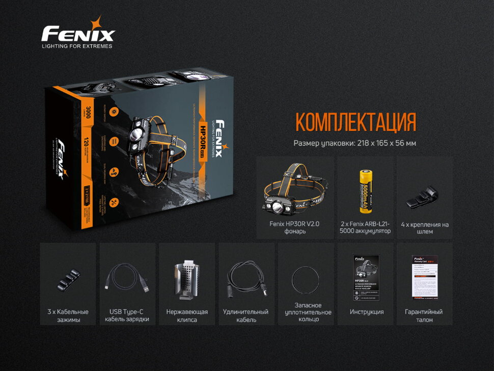 Модель фонаря Fenix HP30R V2.0; два литий-ионных аккумулятора Fenix ARB-L21-5000; кабель для зарядки USB Type-C; четыре крючка для крепления к шлему; три клипсы для кабеля; крепления для ремня из нержавеющей стали; удлинительный кабель; запасное уплотнительное кольцо; инструкция к применению; талон гарантии.