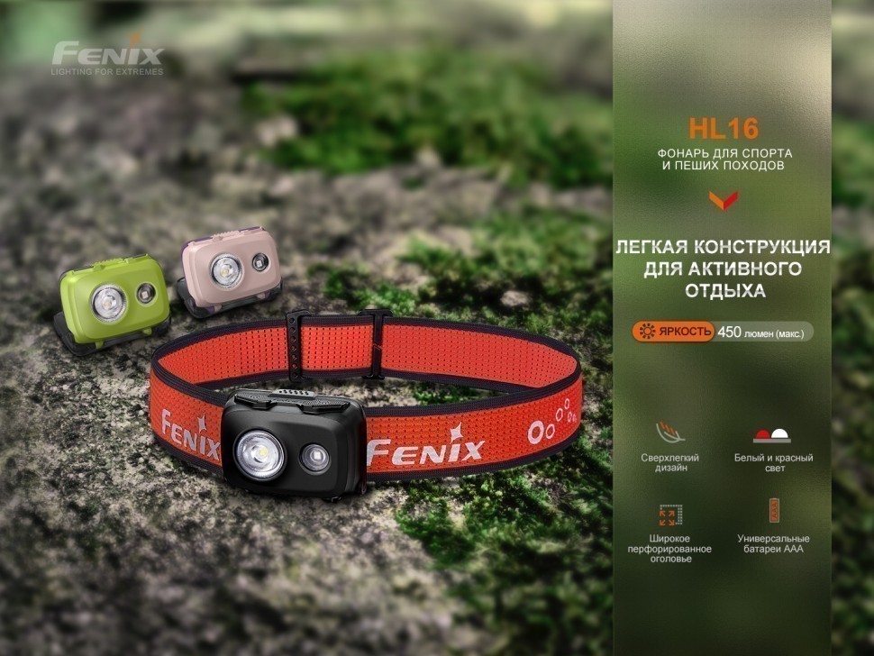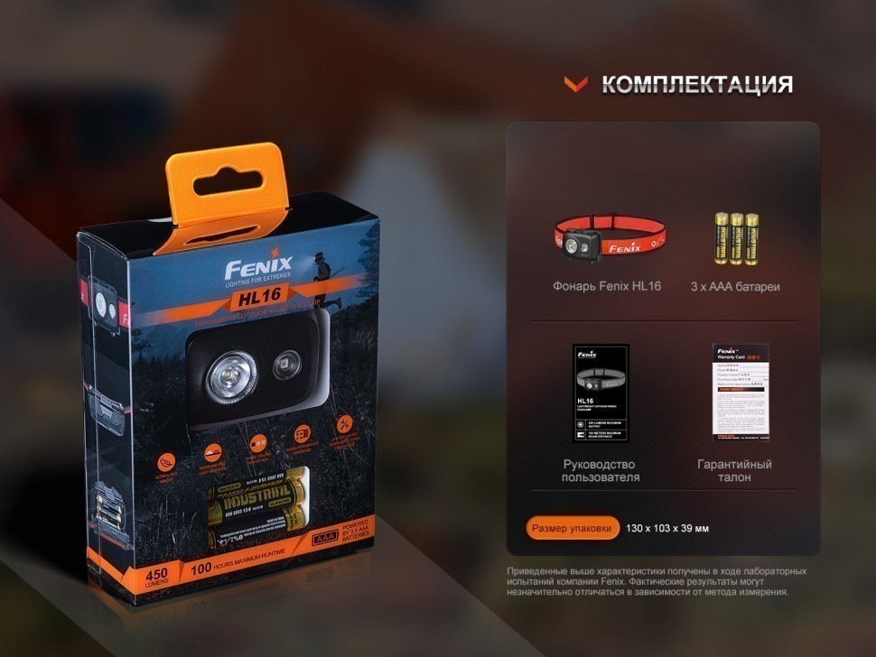Налобный фонарь Fenix HL16, 3 батарейки типоразмера ААА, перфорированное оголовье, гарантия, инструкция пользователя.