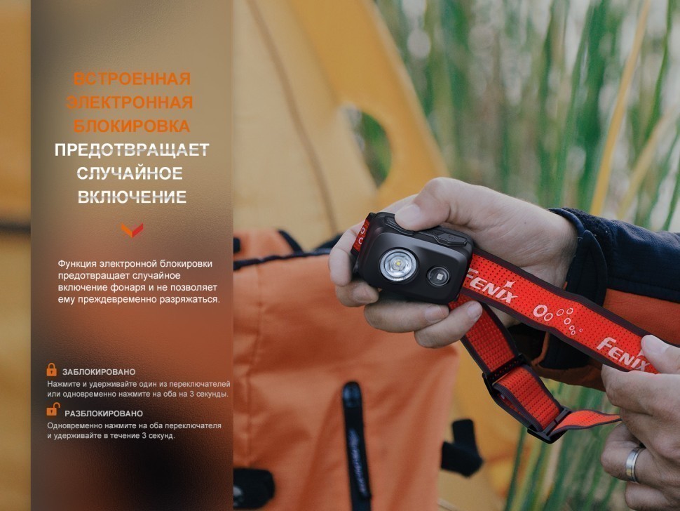 В налобном фонаре предусмотрена опция запоминания последнего режима, а также возможность электронной блокировки интерфейса. Чтобы активировать блокировку, нужно зажать две кнопки одновременно в течение 3-х секунд и дождаться, когда модель четырежды замигает красным. Разблокировка производится аналогичным способом — зажатием двух переключателей.