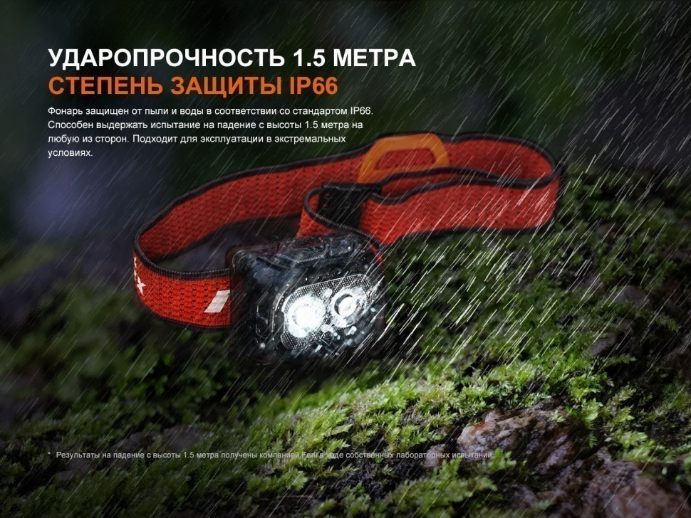 Модель Fenix HL18R-T V2.0 соответствует стандарту IP66, что обеспечивает надежную защиту от пыли и сильного дождя. Конструкция выдерживает падение с высоты до 1,5 метра, что делает фонарь надежным спутником даже в экстремальных условиях.