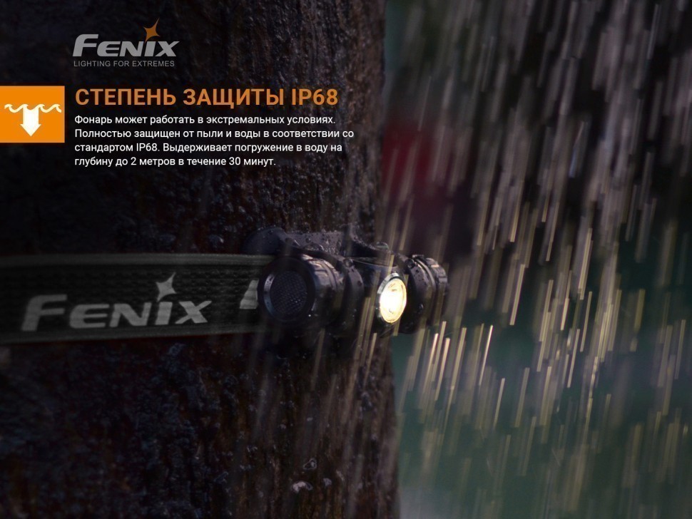 Fenix HM23SE входит в класс герметичности IP68. Электроника надежно защищена корпусом из алюминия, в который не попадают мелкие частички пыли и не просачивается вода даже при погружении фонаря в воду. Благодаря легкому материалу, фонарь без дополнительного крепления весит всего 61 грамма (без элементов питания). Эластичный ремешок лимитированного черного цвета оснащен пластиковым держателем, который поворачивается на 180˚. С его помощью фонарь можно установить устройство в любое удобное для вас положение. Кроме цвета также есть небольшое отличие в дизайне ремешка — отсутствуют светодиодные вставки.
