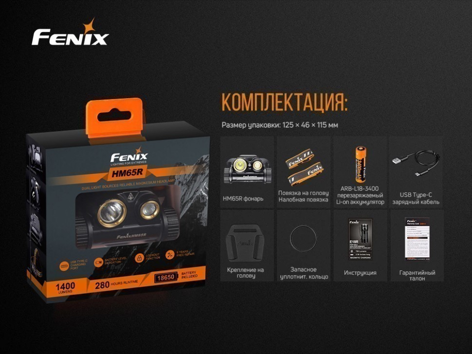 Комплектация: Модель Fenix HM65R, ремешок и крепления на голову, фирменный аккумулятор ARB-L18-3400, уплотнительное кольцо, кабель USB type-C для зарядки.