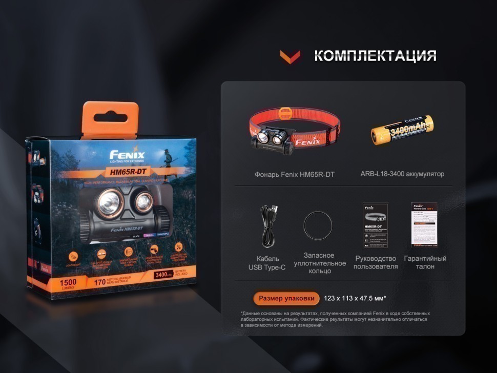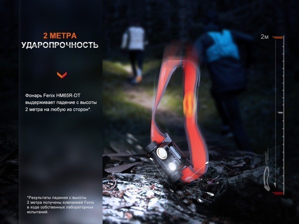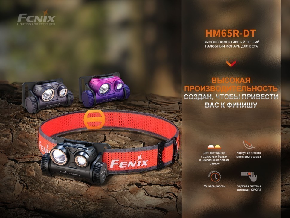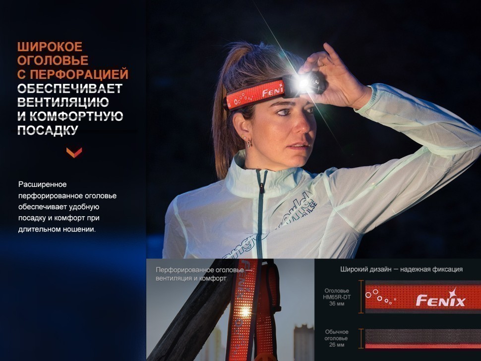 Fenix HM65R-DT разработан в облегченной версии специально для бегунов, участвующих в трейлраннинге, спортивном ориентировании и других соревнованиях, подразумевающих наличие дополнительного освещения. Налобный фонарь Fenix HM65R-DT по габаритам занимает 8 × 4,7 × 3,9 см. Вес фонаря составляет 91 грамм.