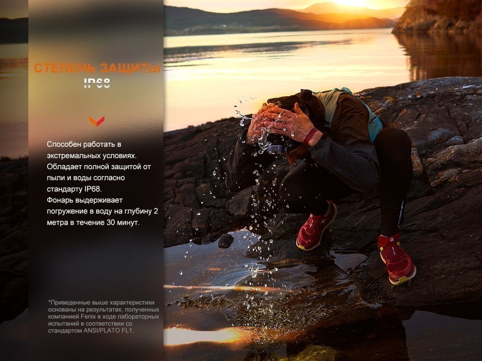 Корпус и фиксирующий ремешок. Корпус фонаря полностью изготовлен из легкого магниевого сплава, благодаря чему фонарь не давит на голову даже спустя долгое время. Материал имеет стандарт водонепроницаемости IP68, что позволяет владельцу до 30 минут находиться на двухметровой глубине. Ударопрочность фонаря до 2 метров. Плотная конструкция защищает электронику от агрессивных перепадов температур — от -35°C до 45°C.