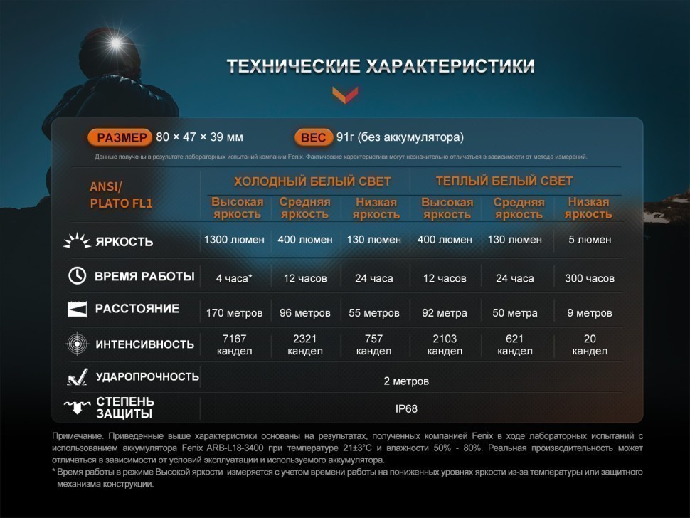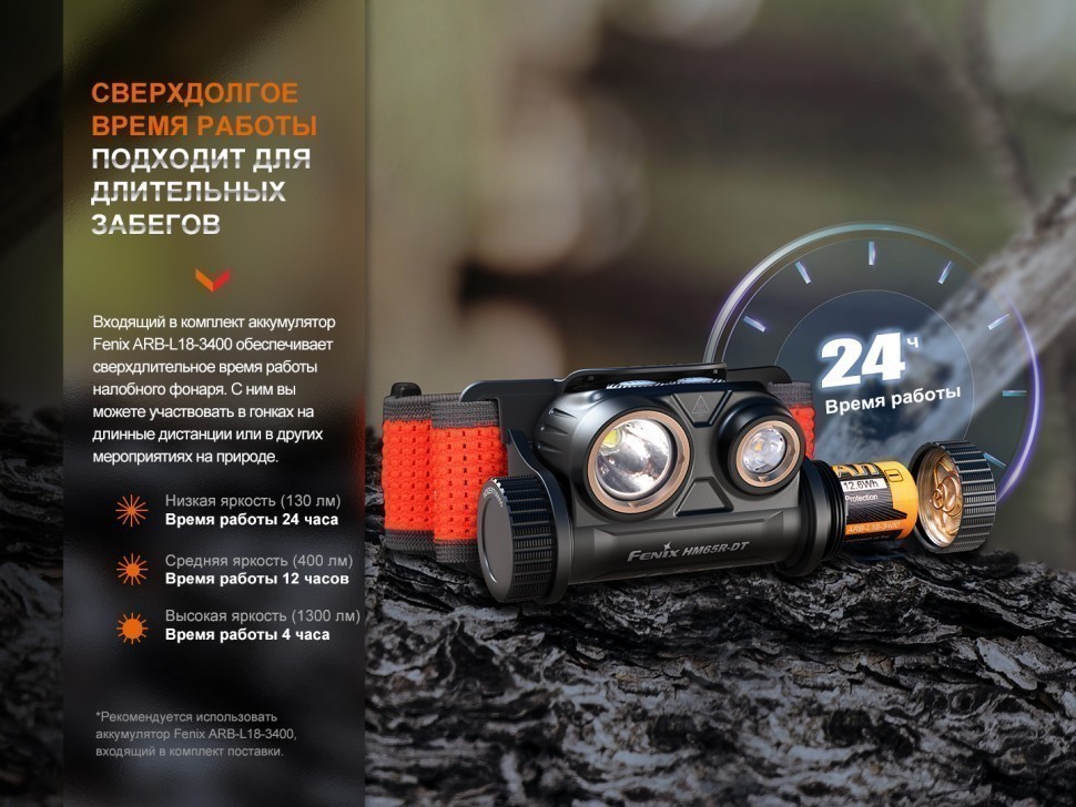 - питание от аккумулятора — Fenix ARB-L18-3400, типа 18650