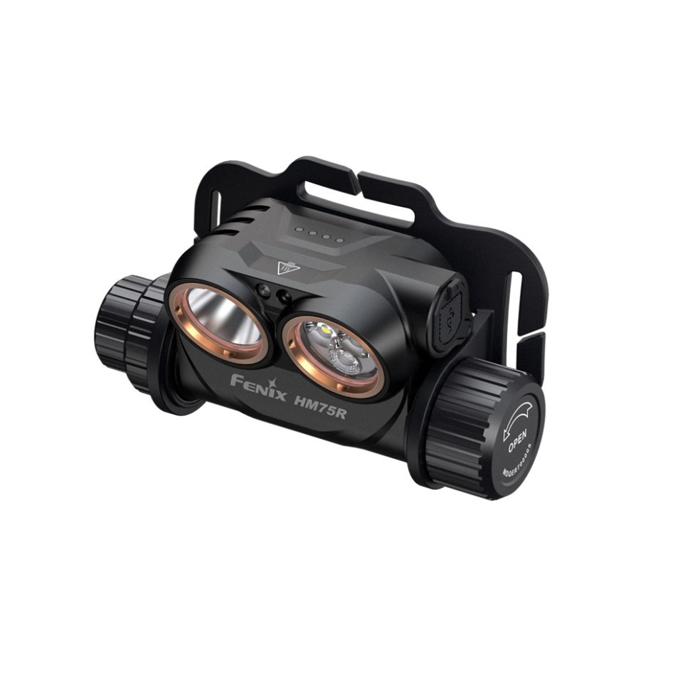 Модель оснащена тремя светодиодами: 2 холодных белых — LUMINUS SST40 и LUMINUS SST20 и один красный — OSRAM GR QSSPA1.23. Каждый светодиод имеет гарантированный срок службы 50 000 часов. Fenix HM75R автоматически регулирует яркость, чтобы избежать перегрева и потенциального риска возгорания. Переход между режимами осуществляется с помощью поворотного переключателя и электрической кнопки.