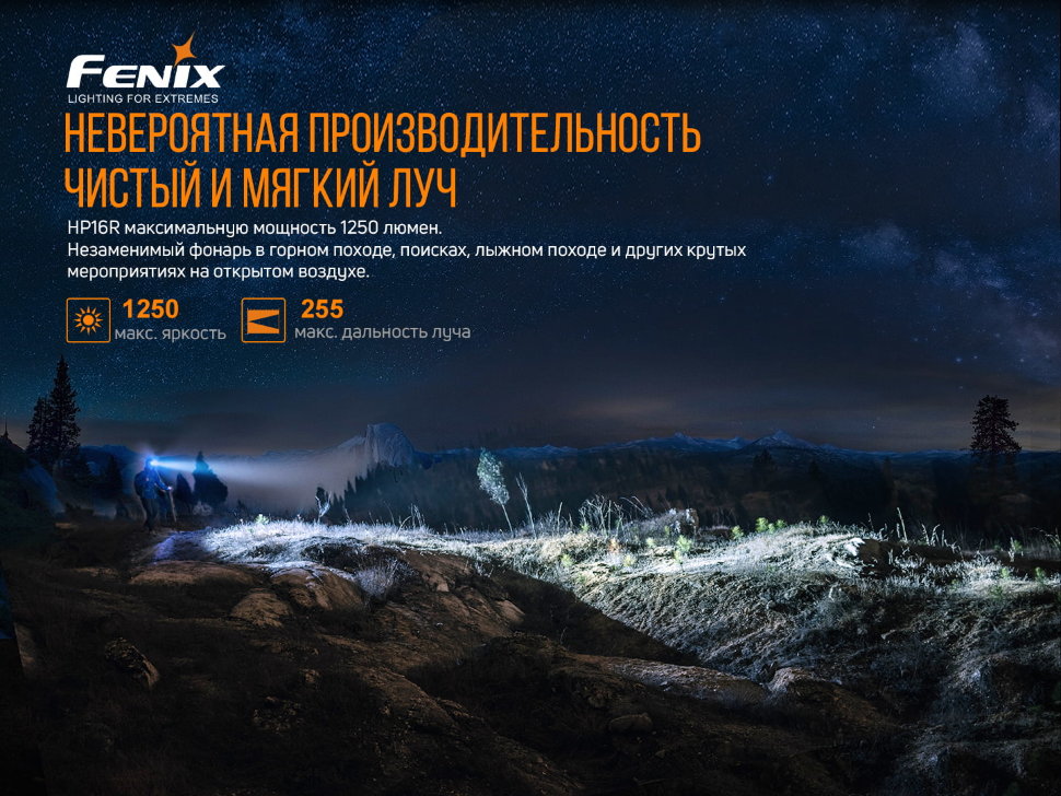 Налобный фонарь Fenix HP16R является перезаряжаемой высокопроизводительной моделью. Он обеспечивает пользователю яркость в 1250 люменов, а дальнобойность достигает 260 метров. Фонарь может работать в течение 300 часов в Минимальном режиме. Есть отдельный батарейный отсек, питание происходит от литий-полимерного аккумулятора Fenix ARB-LP3000. Также элементами питания могут быть четыре батареи Ni-MH/щелочные типа AA. Заряжать батареи нельзя. Аккумулятор заряжается через порт USB Type-C в батарейном отсеке. Чтобы полностью зарядить эту модель, потребуется 3 часа времени.