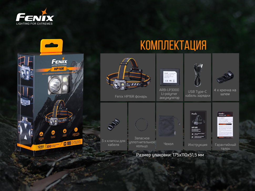 Модель фонаря Fenix HP16R, аккумулятор ARB-LP3000 Li-polymer, кабель для зарядки USB Type-C, четыре крючка для крепления на шлем, три клипсы для кабеля, запасное уплотнительное кольцо, сумка для хранения, инструкция пользователя, талон гарантии.