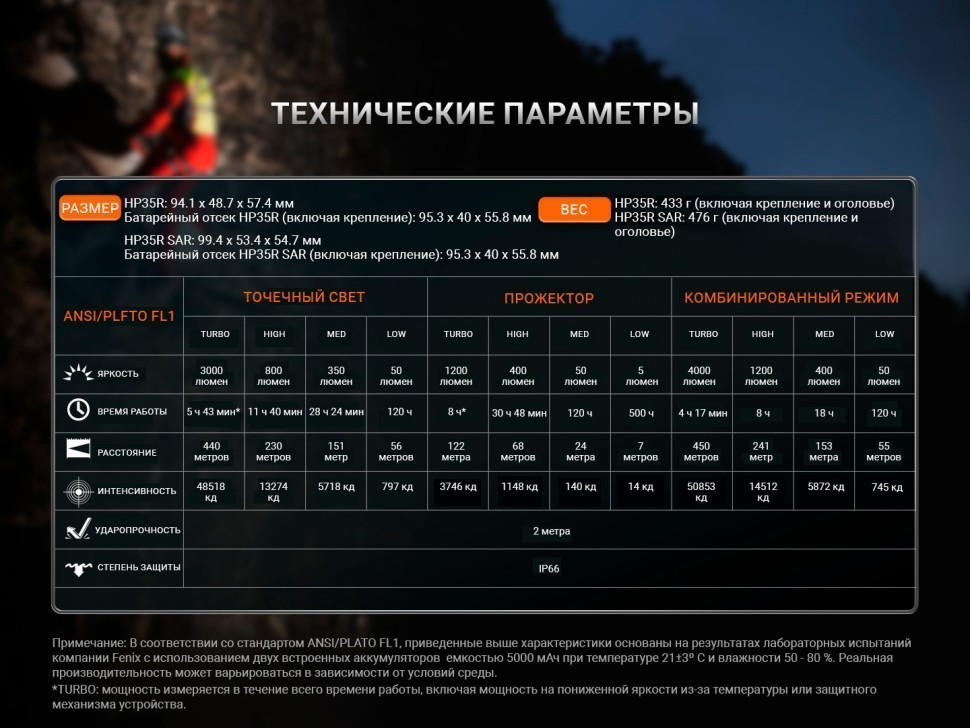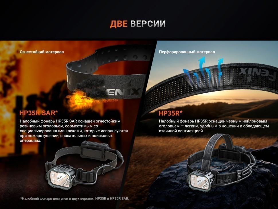 Основной особенностью модели Fenix HP35R Search And Rescue (SAR) является высокая светоотдача и дальность освещения. Прожекторы и светильники заливающего света обеспечивают максимальную светоотдачу 4000 люмен, а прожекторы с высоким индексом цветопередачи — 1200 люмен. Фонарь использует один светодиод нейтрального белого света XHP70 и два светодиода теплого белого света Luminus SST20, срок службы каждого из которых составляет 50 000 часов.