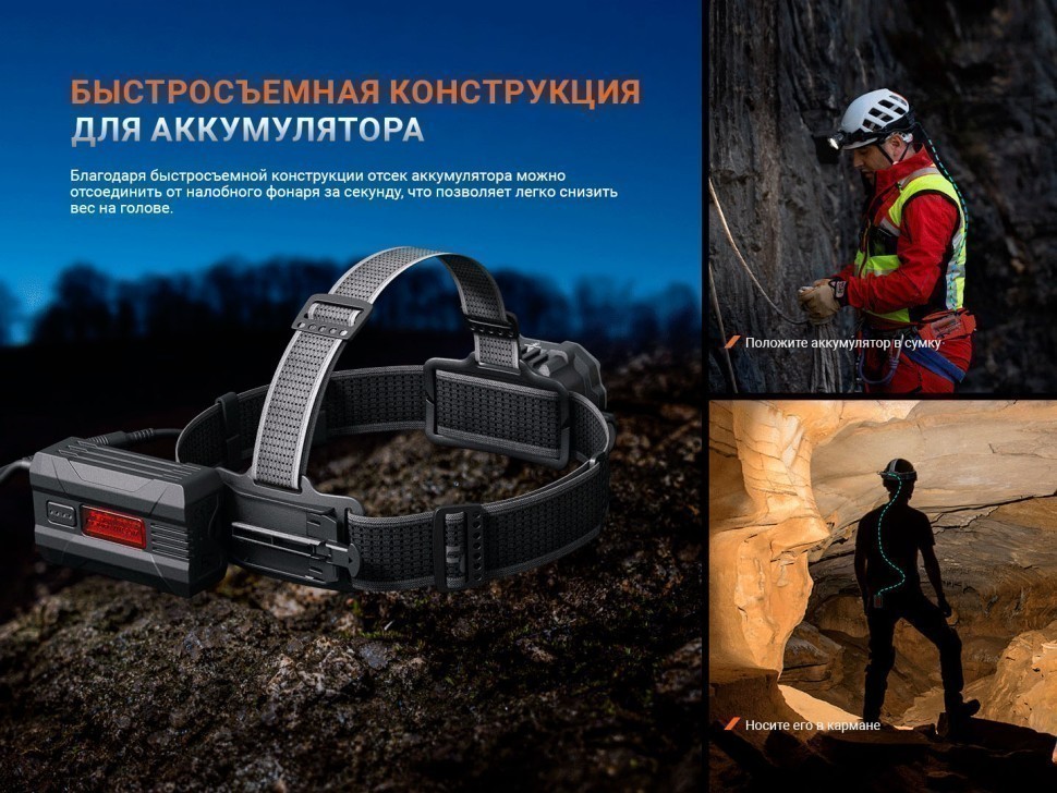 Размеры фонаря составляют 99.4 × 53.4 × 54.7 мм, а батарейного отсека – 95.3 × 39.8 × 53.5 мм. Вес фонаря, включая оголовье и аккумуляторный отсек, составляет 476 г. Параметры обеспечивают удобство и надежность в использовании, что особенно важно для продолжительной работы на открытом воздухе.
