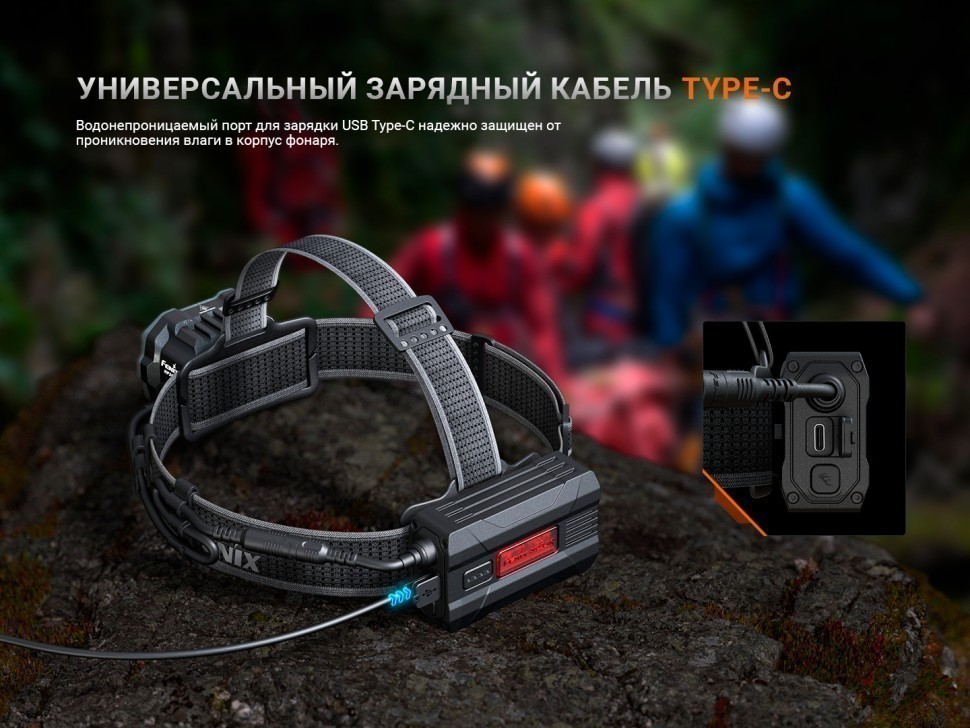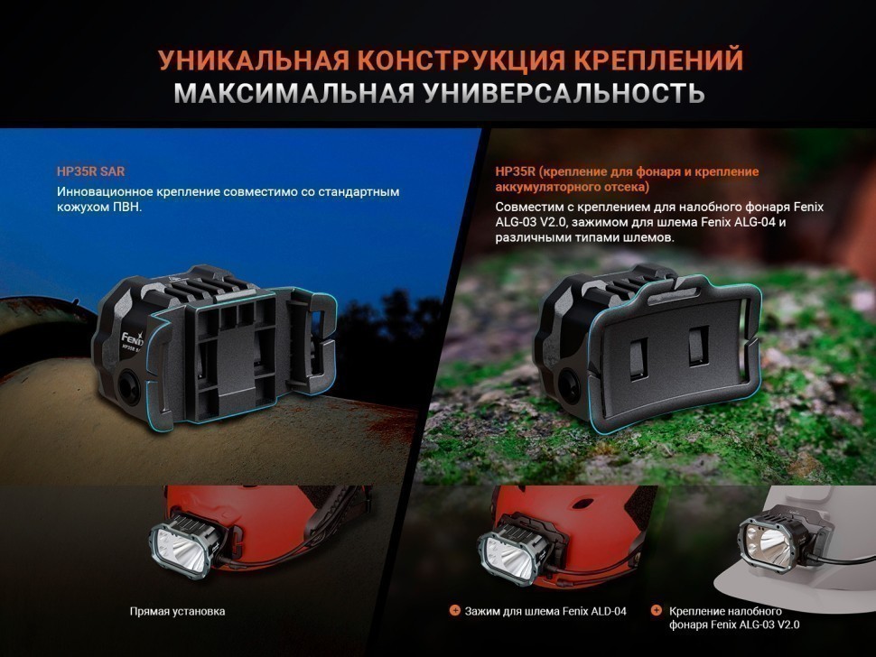 Корпус модели Fenix HP35R SAR выполнен из алюминиевого сплава с анодированным покрытием, что делает его устойчивым к коррозии и механическим повреждениям. Огнестойкое резиновое оголовье разработано по специальному дизайну, благодаря которому оно совмещается со шлемами, используемыми при пожарах, спасательных и чрезвычайных ситуациях, спасательной и промышленной деятельности. Крепление совместимо с кожухом ПНВ и напрямую к нему крепится. Водонепроницаемый порт зарядки USB Type-C и степень защиты IP66 гарантируют стабильную работу фонаря в любых погодных условиях. Выдерживает падение с высоты до двух метров.
