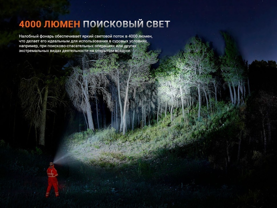 Светодиодный поисковый фонарь питается от батареи емкостью 10 000 мАч. Аккумулятор обеспечивает до 500 часов непрерывного освещения. Батарея находится в затылочной части и снимается с крепления для использования в качестве Powerbank. Также фонарь Fenix HP35R SAR оснащен следующими функциями: режимы сохранения ночного видения, интеллектуальная функция понижения яркости для предотвращения перегрева, а также поворотный и электронный переключатели для удобного управления.
