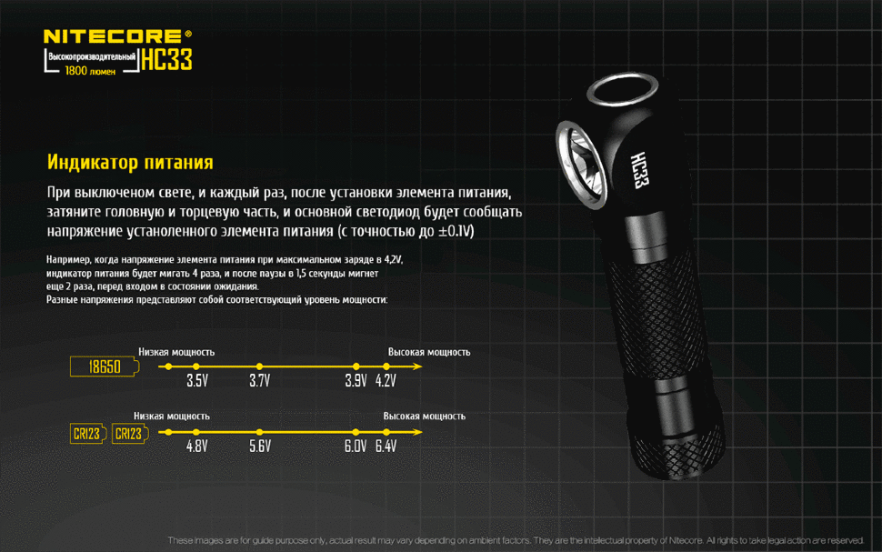 Указанные выше в описании значения о времени работы, были измерены в полном соответствии с международными стандартами тестирования фонарей, при использовании трех различных видов элементов питания, 1хIMR18650 (3.6V, 3100mAh), 1x18650 (3.7V, 3500mAh) и 2xCR123 (3V, 1700mAh) в лабораторных условиях. Указанные выше значения о времени работы, могут изменяться в зависимости от условий его использования.