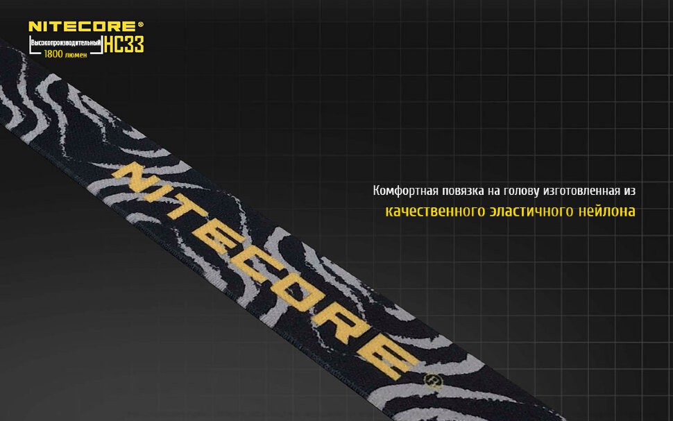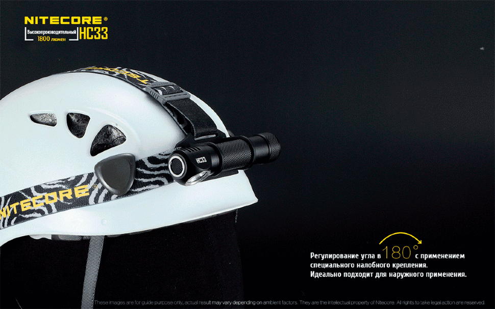 Налобный фонарь с универсальной сферой применения, наделен производителем невероятными функциями и возможностями для работы. Для оптимального функционирование фонаря в различных условиях, так как устройство предназначено для любых видов работ, и будет пригодно для ежедневного применения как карманного назначения, так и налобного на креплении входящее в комплект. Устройство Nitecore HC33 проходило тестирование в лабораторных условиях, в ходе которых были установлены максимальные значения периода работы и составляют 330 часов при свечении Минимального режима с излучаемой мощностью в 1 люмен. Фонарь имеет продолговатую форму, что располагает на размещение одного элемента питания. Элементом для стабильной работы фонаря, и обеспечения всех его технических характеристик используется 3 различных вида элемента питания – это литиево-ионные аккумуляторы типоразмером 18650, IMR18650, CR123 и литиевая батарея типа CR123. В отсеке, предназначенном для размещения аккумулятора, возможна установка одного элемента питания типа 18650 и двух элементов питания типоразмером CR123 и RCR123. Также для обеспечения оптимальных параметров свечения, возможна работа на литий-ионном аккумуляторе нового поколения с выходным током в 8V и общим объёмом в 3500mAh. Главным недостатком использования CR123 и RCR123 элементов питания, является отсутствие одного важного режима в 1800 люмен, максимальный возможный режим – это Высокий с яркостью в 780 люмен и временем беспрерывного свечения в 1 час 15 минут. При работе Турбо режима и с использованием перезаряжаемых аккумуляторов типоразмером 18650 время беспрерывного свечения составляет 30 минут, но при работе самого низкого режима, время работы отличается на всех используемых элементах питания, на IMR18650 составляет 300 часов, 18650 – 330 часов и при CR123 – 200 часов.