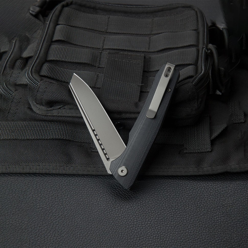 Рукоять ножа изготовлена из стеклотекстолита G10 черного цвета — прочного и надежного композитного материала, состоящего из стеклоткани и эпоксидной смолы. G10 прекрасно противостоит ударам, влаге и перепадам температур. Также на рукояти предусмотрена стальная клипса глубокой посадки для удобного крепления на карман или на пояс.