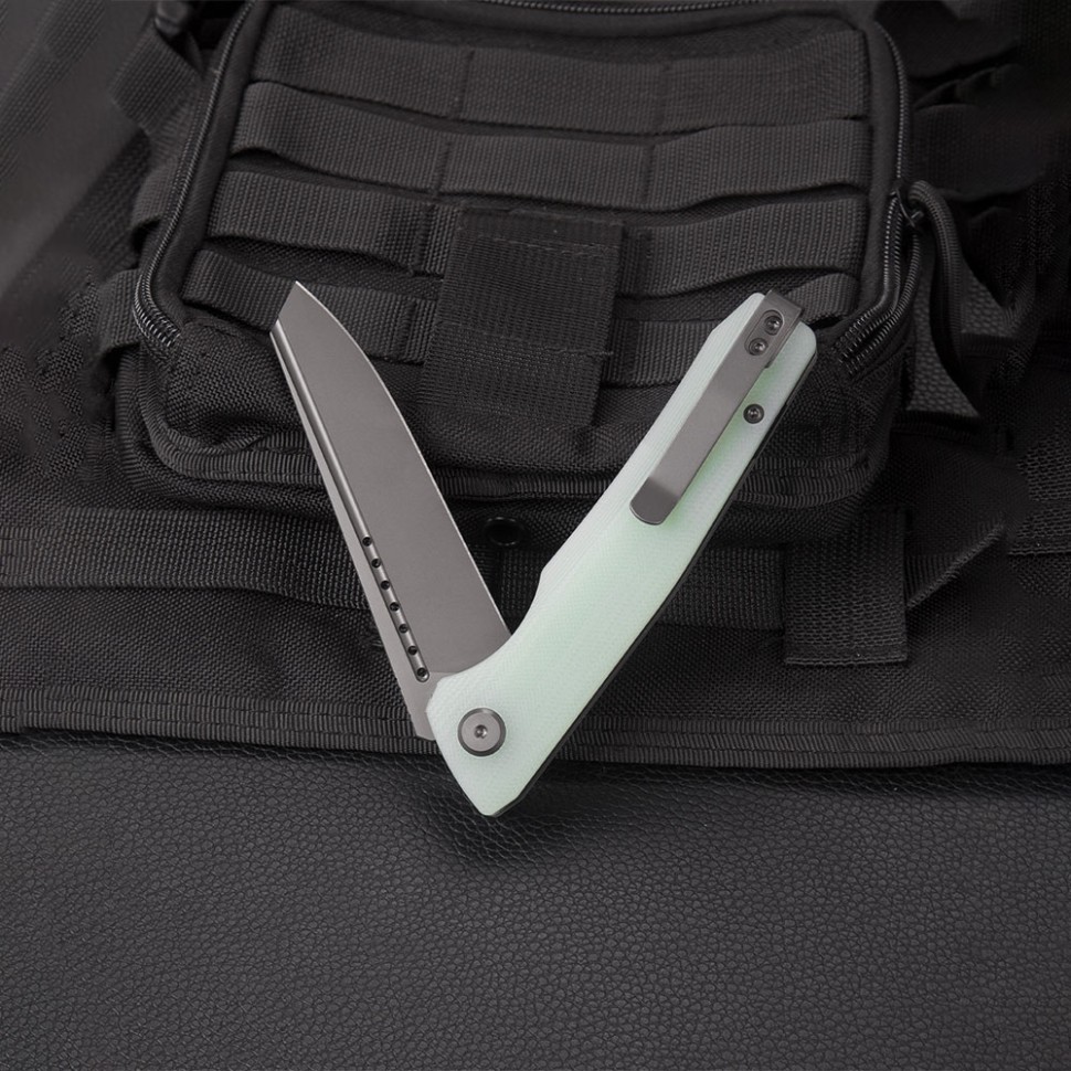 Прозрачная рукоять ножа изготовлена из стеклотекстолита G10 нефритового цвета — прочного и надежного композитного материала, состоящего из стеклоткани и эпоксидной смолы. G10 прекрасно противостоит ударам, влаге и перепадам температур. Также на рукояти предусмотрена стальная клипса глубокой посадки для удобного крепления на карман или на пояс.
