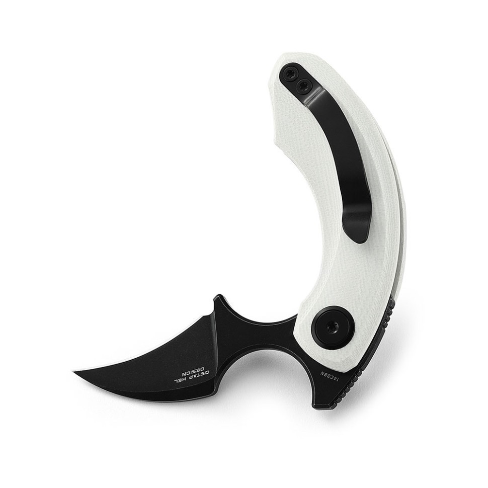Нож Bestech Strelit имеет необычный и экстравагантный дизайн: маленький клинок профиля hawkbill blade фиксируется под почти прямым углом к рукоятке, что позволяет удобно вскрывать коробки, пакеты и другие упаковочные материалы. Удержание ножа предусмотрено таким образом, чтобы хвостовик клинка проходил между указательным и средним пальцами.