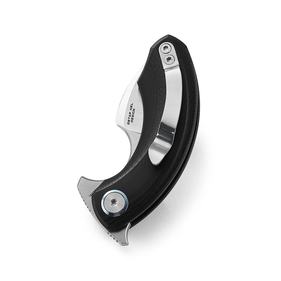 Нож Bestech Strelit имеет необычный и экстравагантный дизайн: маленький клинок профиля hawkbill blade фиксируется под почти прямым углом к рукоятке, что позволяет удобно вскрывать коробки, пакеты и другие упаковочные материалы. Удержание ножа предусмотрено таким образом, чтобы хвостовик клинка проходил между указательным и средним пальцами.