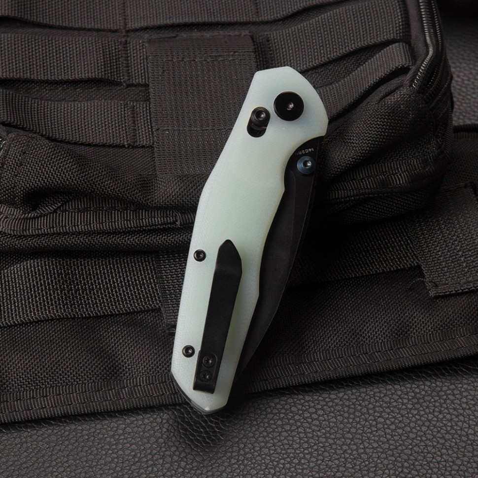 Рукоять ножа Bestechman Ronan выполнена из нефритового G10 нефритового цвета, прочного и влагонепроницаемого композитного материала на основе стеклоткани и эпоксидной смолы. Рукоять имеет удобную форму с выемками под пальцы и внушительным упором, который защищает руку от соскальзывания на режущую кромку. Также рукоять оснащена удобной клипсой типа mini deep.