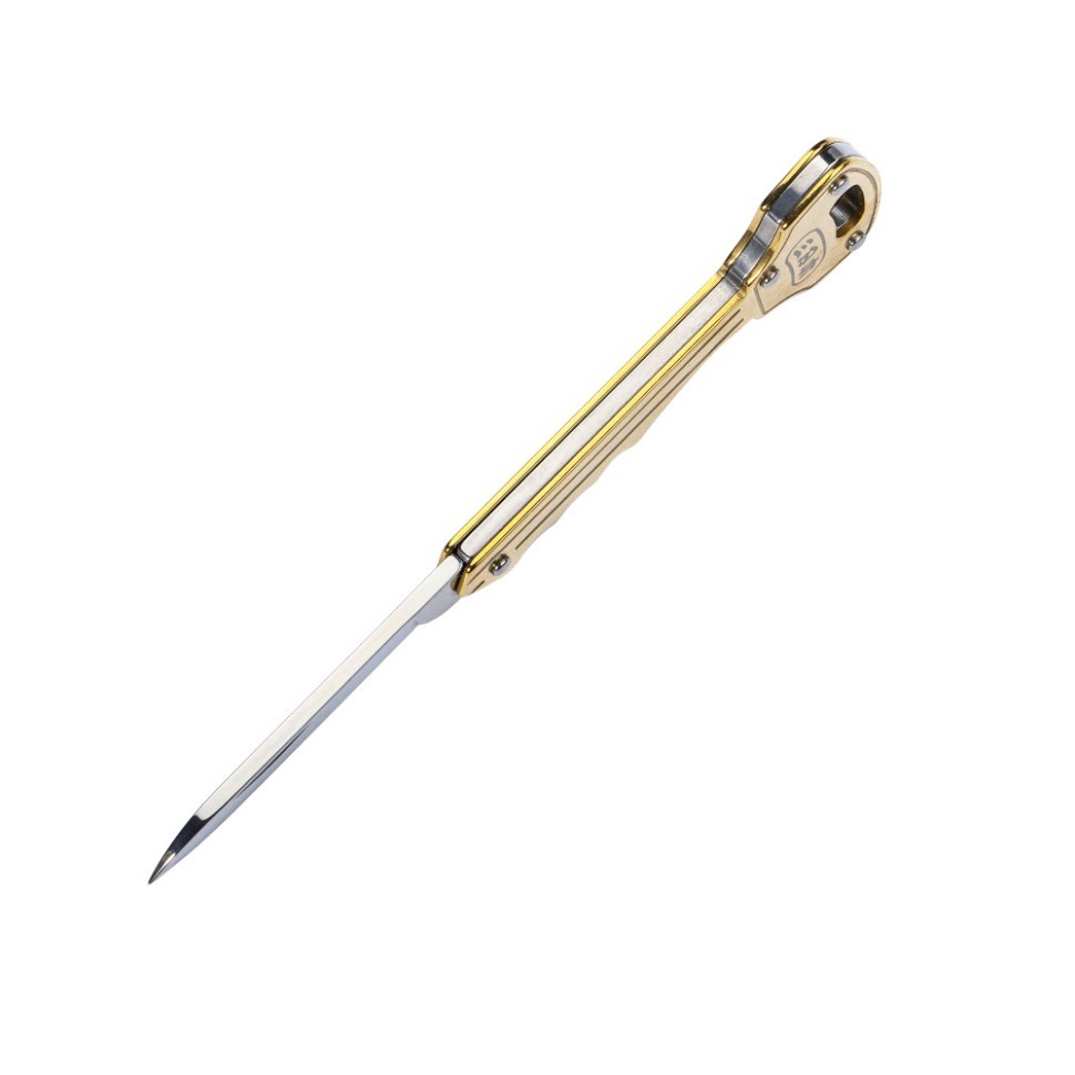 Клинок фиксируется в открытом положении при помощи возвратной пружины Slip Joint, а раскрытие осуществляется за счет ногтевого захвата. Форма клинка — универсальная Drop Point с плоскими спусками и полированной поверхностью.